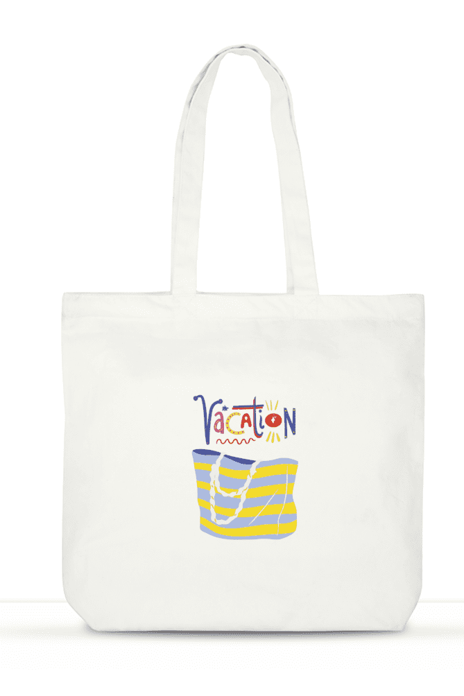 • What color is the bag? The bag is white with a vacation-themed design printed on one side.