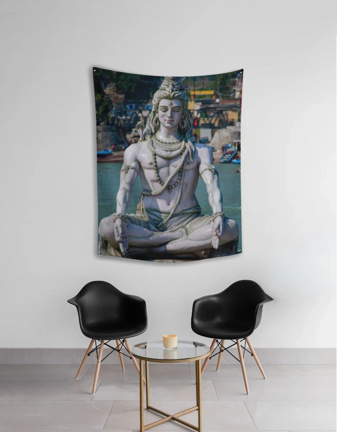 - What is the material of the Meditating Shiva at Rishikesh tapestry?